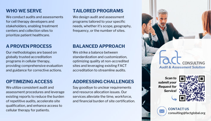 Cell and gene sponsors, license holders, manufacturers, registries, collection sites, processing laboratories, and treatment sites are invited to learn how FACT Consulting Audit & Assessment Solution increases the return on investment in site assessments via specific, high-value benefits.